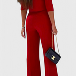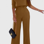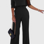 L'ensemble Cleo allie élégance décontractée et design structuré pour sublimer votre silhouette. Son top à manches 3/4 offre une touche classique, tandis que le pantalon à jambes larges allonge la silhouette avec sophistication.