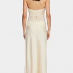 Élégance Moderne et Romantique: L'ensemble Fjorela combine un haut structuré sans bretelles et une jupe midi asymétrique fluide, parfait pour vos événements.