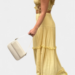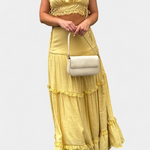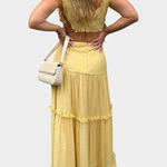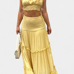 L'ensemble Ilys est une véritable célébration de la féminité éthérée. Ce look se compose d'un crop top avec des bretelles ajustables et des détails en dentelle, associé à une jupe maxi fluide ornée de couches délicates.