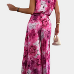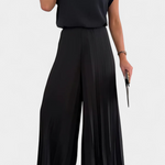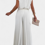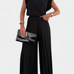Ce look se compose d'un top sans manches avec un dos ouvert et des épaulettes définies, associé à des pantalons plissés à jambes larges qui offrent une élégance fluide.