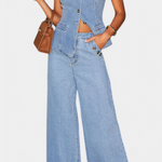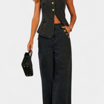 L'ensemble Ludovica redéfinit le denim avec une touche sophistiquée. Le gilet ajusté sans manches épouse la silhouette avec élégance grâce à sa fermeture à boutons, tandis que les jeans à jambes larges et taille haute offrent confort et style décontracté.