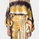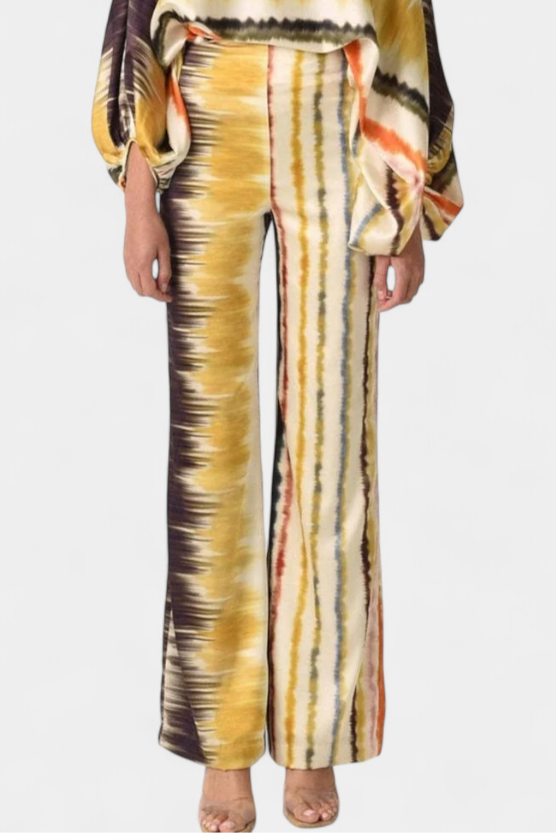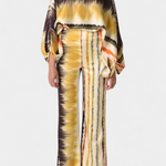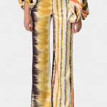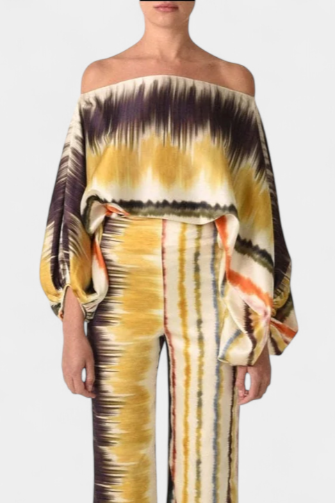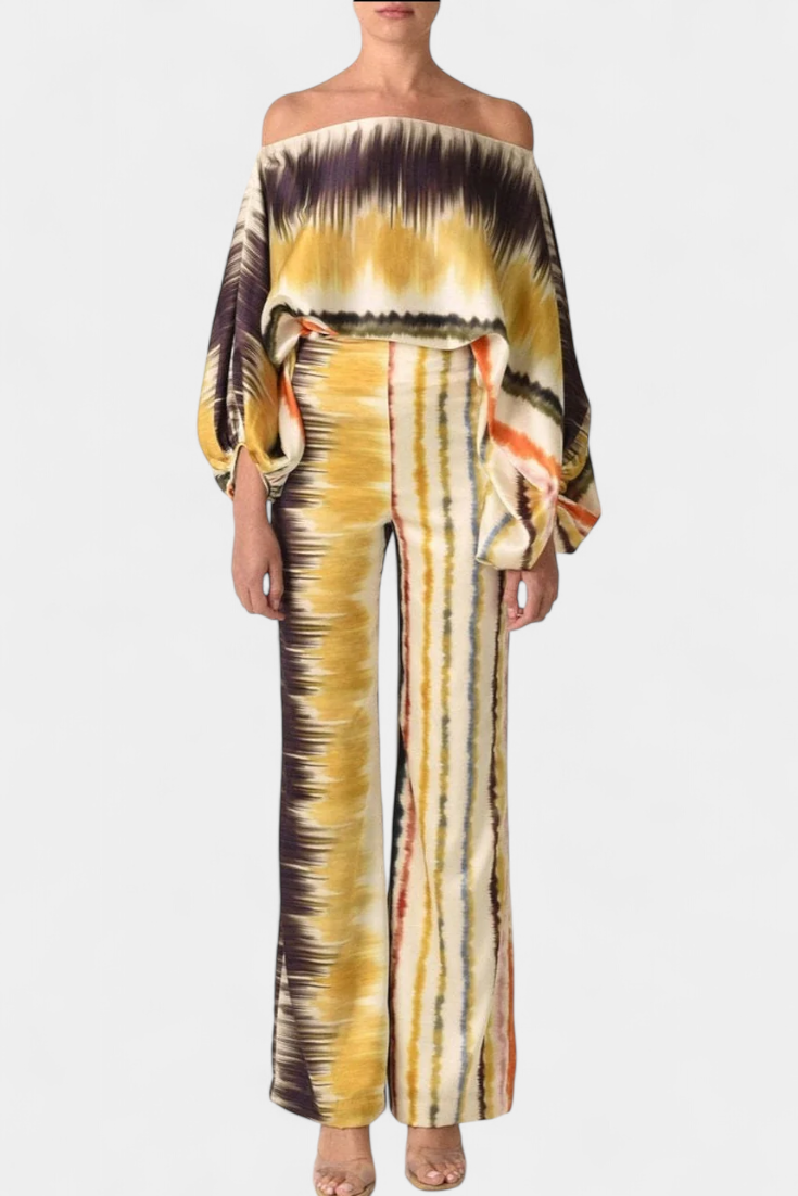 Découvrez l'ensemble Sybella, alliant style décontracté et touche romantique. Ce look unique comprend un haut à épaules dénudées et des manches bouffantes, associé à des pantalons à jambes larges avec un imprimé artistique.