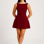 Cette création séduit par sa ligne structurée et sa forme trapèze qui offre une allure équilibrée et fluide. Son design sans manches et sa longueur courte apportent une élégance épurée, idéale pour les journées estivales comme pour des occasions soignées.