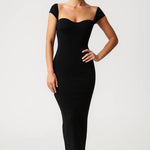 Cette création ajustée séduit par son encolure carrée et ses manches courtes structurées, offrant une allure élégante et affirmée.