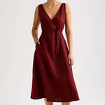 Cette création sans manches séduit par son décolleté croisé et sa ligne fluide qui structure la silhouette avec naturel.