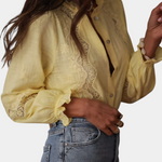 Laissez entrer le soleil avec la Blouse en Dentelle Catarina, un mélange romantique de douce féminité et de charme bohème. Cette pièce de rêve se distingue par ses panneaux délicats en dentelle, ses manches légèrement bouffantes et son devant à boutons flatteur. La chaude teinte jaune illumine votre look, tandis que l'intriqué broderie ajoute une touche d'âme vintage.