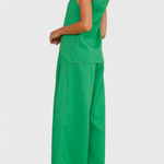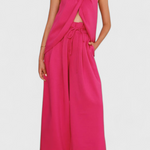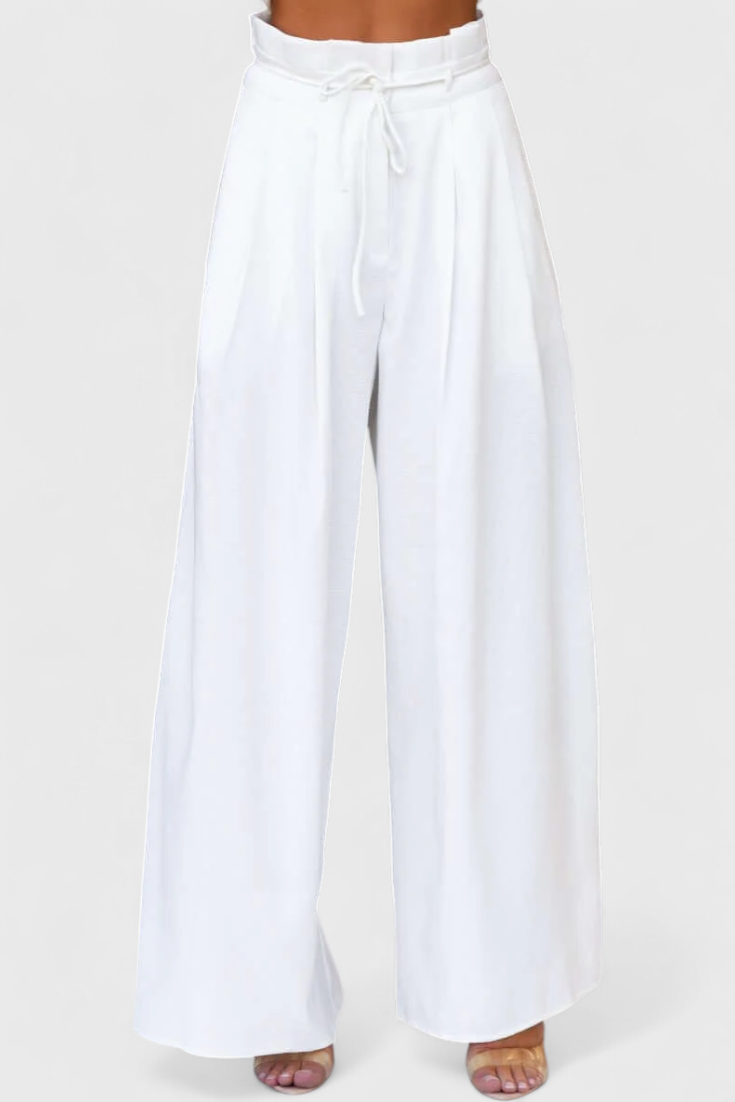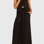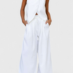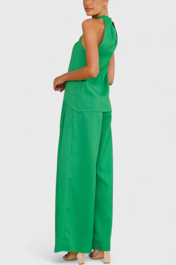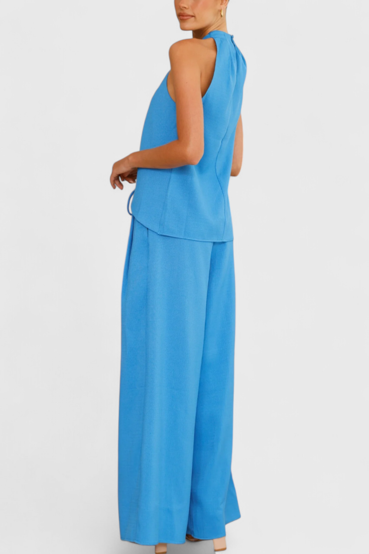 Découvrez l'ensemble Bernadina, une fusion parfaite de décontracté et sophistiqué. Ce look irrésistible associe un top sans manches à col haut et ouverture frontale, allongeant visuellement la silhouette, à un pantalon à jambes amples avec nœud à la taille pour une élégance raffinée.
