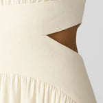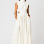 Cette robe présente une construction structurée sur le haut et une jupe fluide plissée qui apporte équilibre et légèreté à la silhouette.