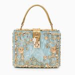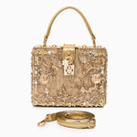 Ce sac en forme de boîte est embelli par des décorations florales dorées uniques, ajoutant une touche féminine et raffinée.